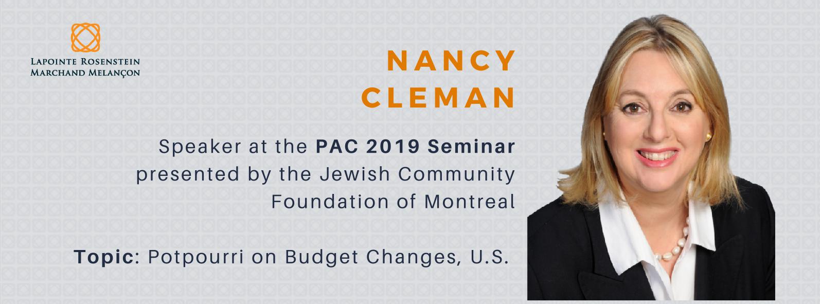 Nancy Cleman will speak at the PAC 2019 Seminar presented by the Jewish Community Foundation of Montreal. In a talk entitled "Potpourri: Budget Changes, U.S.", she will cover upcoming changes to the Canada Business Corporations Act (CBCA) and other related matters.