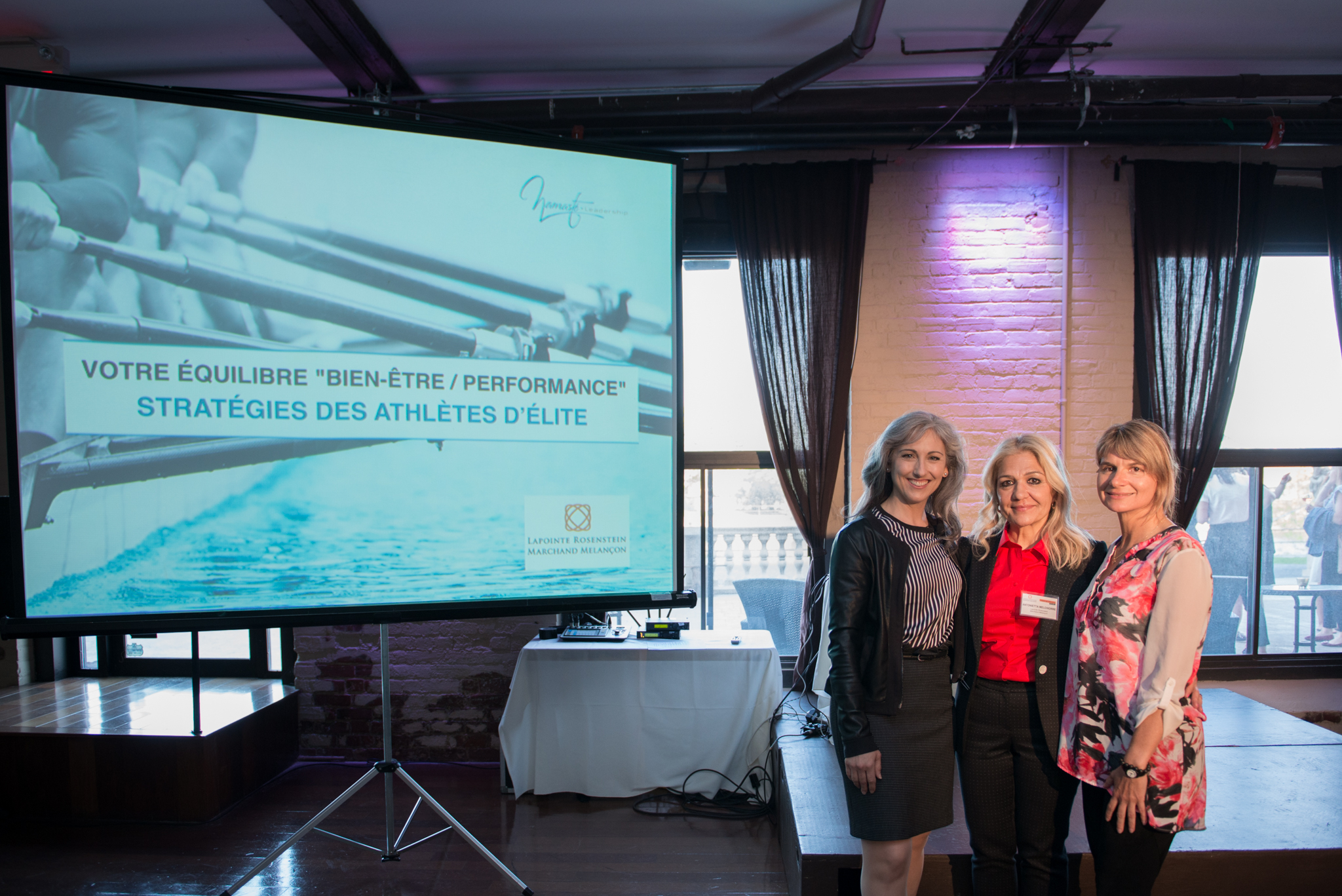 Shown from left to right: Tina Poitras, founder of Namasté Leadership and guest speaker, Antonietta Melchiorre, LRMM partner, and Lise Lapointe, Qi Gong facilitator.
