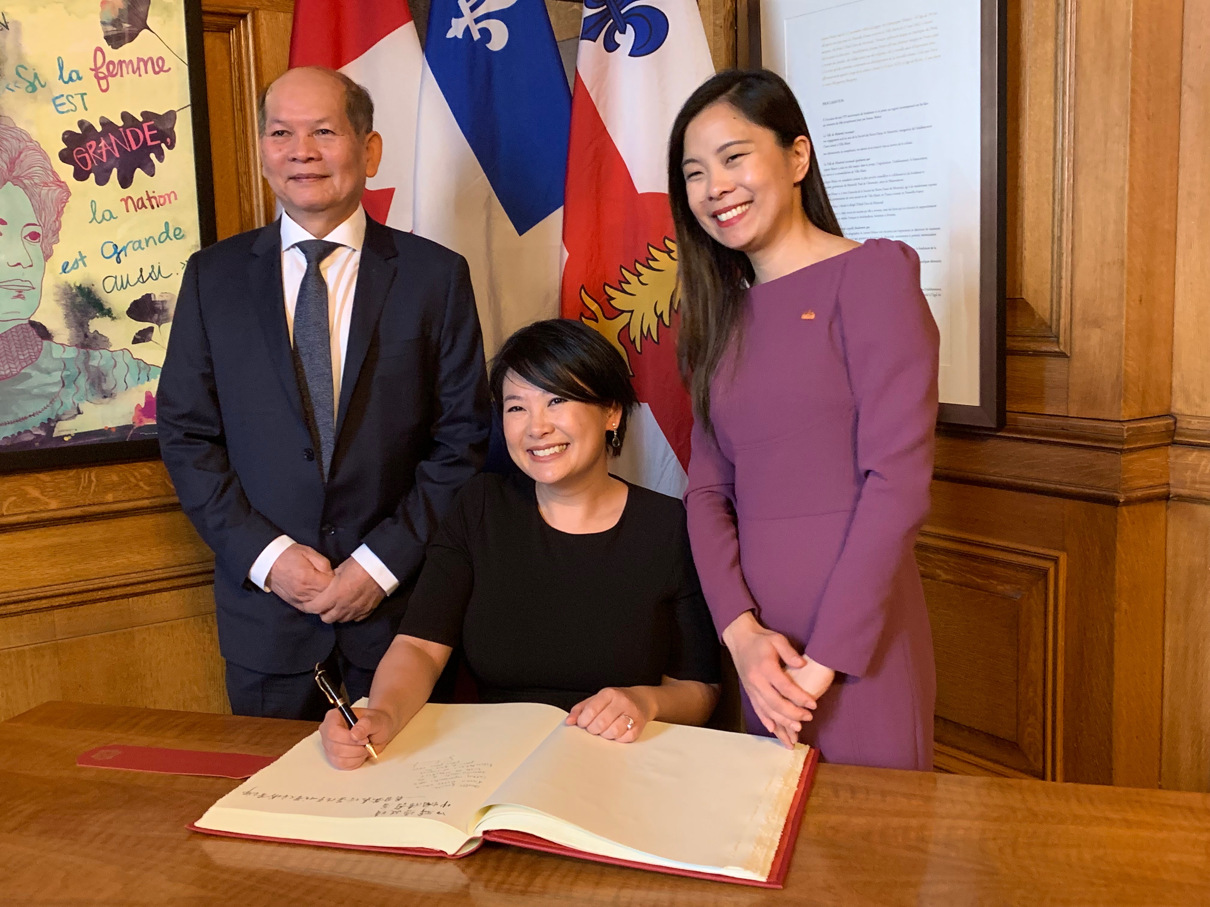 An unforgettable moment for Selena Lu who was invited to sign the guest book — the livre d'or — at Montreal City Hall in recognition of her exceptional contribution to the greater outreach of the Chinese community. She is photographed with her father, Mr. Kok Chai Lu, and Ms. Cathy Wong, speaker of Montreal City Council.