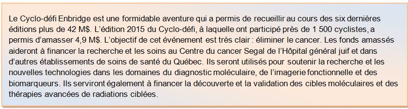 Soulignons que le cabinet peut compter sur la présence et l’appui de Me Howard Dermer, président de la Fondation de l’Hôpital général juif et avocat conseil au sein du cabinet. Ce dernier a présidé les deux premières éditions du Cyclo-défi Enbridge contre le cancer en 2009 et 2010.